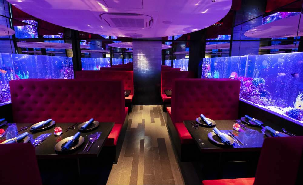 どの席に座っても壁が水槽なのでアクアリウムが楽しめます🐠