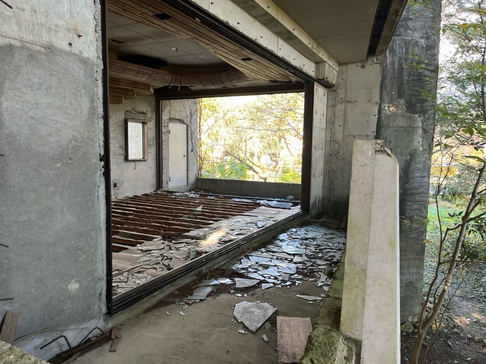ガラスも散らばりまくりで本当にめちゃくちゃ廃墟。